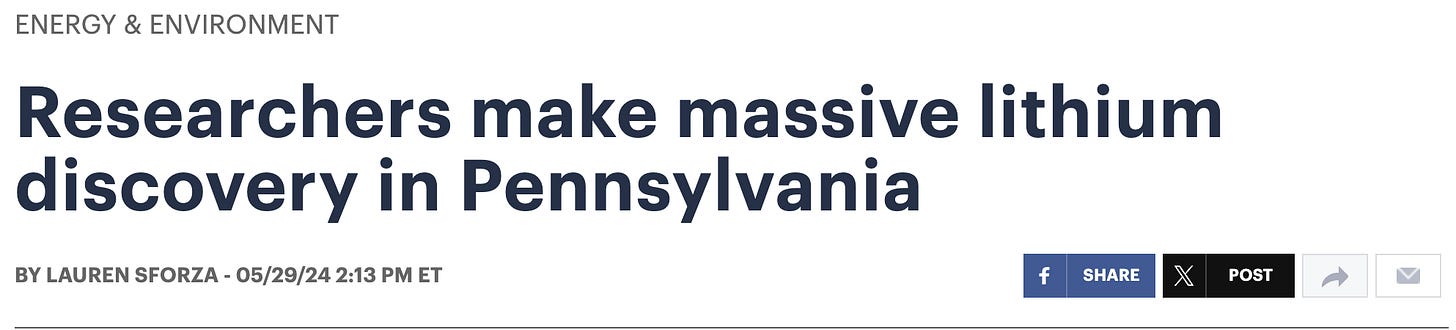 “Scientists from the University of Pittsburgh have discovered a large amount of lithium located in Pennsylvania, saying it could eventually supply more than a third of America’s needs for the mineral.”