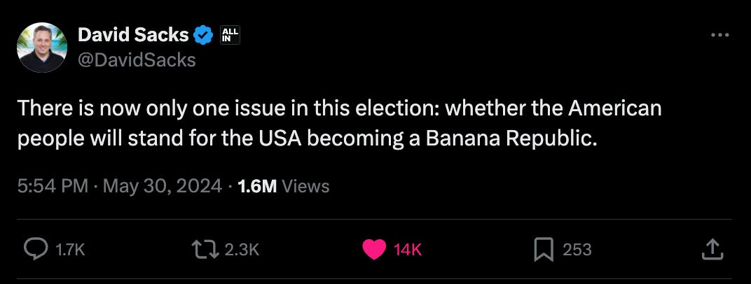 I wrote all of the above yesterday morning. It’s par for the course that everything has kind of changed from a political standpoint in the US over the past 24 hours. I really only care to talk about politics as it relates to macro, but as Florida Governor Ron DeSantis put it quite plainly in a tweet last night: Trump’s conviction yesterday shows how a leftist prosecutor, a partisan judge, and a liberal jury bent the legal process to “get” Trump. This case, involving alleged misdemeanour business records violations from nearly a decade ago, highlights the political debasement of the justice system. If it weren't Trump, this case wouldn't have even been brought.