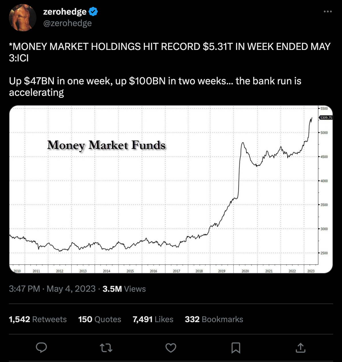 Sure, maybe initially people were moving their money out of regional banks to the JP Morgan’s of the world because they were worried about deposit security after the abrupt failure of SVB, but I don’t give much credence to this narrative. The reason why there is a historic capital flight from banks is that they’re offering you 0.1% on your savings while the Fed is giving you 5%. So, with a click of a button, folks are moving their hard earned dough to their new Apple Savings account at 4.15% or to a money market fund offering a similar yield.