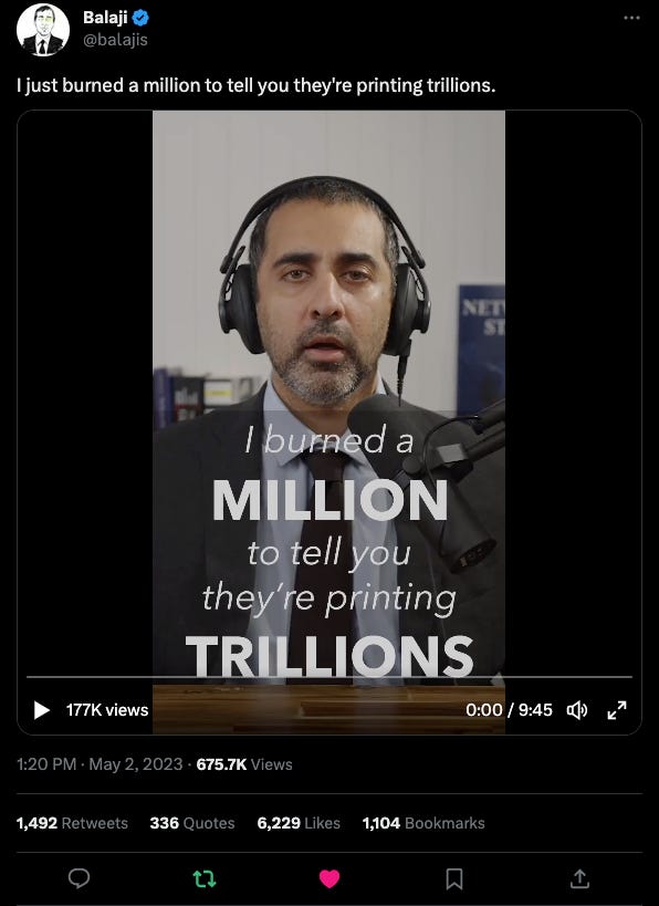 Remember when Balaji threw up the #BitSignal mid-March and called for $1M BTC in 90 days? He’s been silent since his Twitter rampage and podcast tour which lasted until early April. He broke his silence this week: