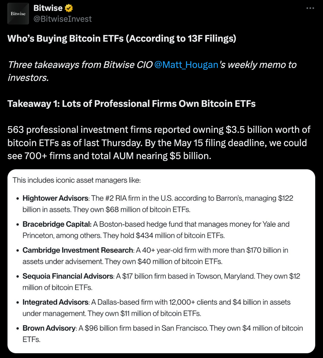 Click this tweet below for a pretty good tweet thread summary of institutional participation by Bitwise — the more bitcoin-native ETF issuer: