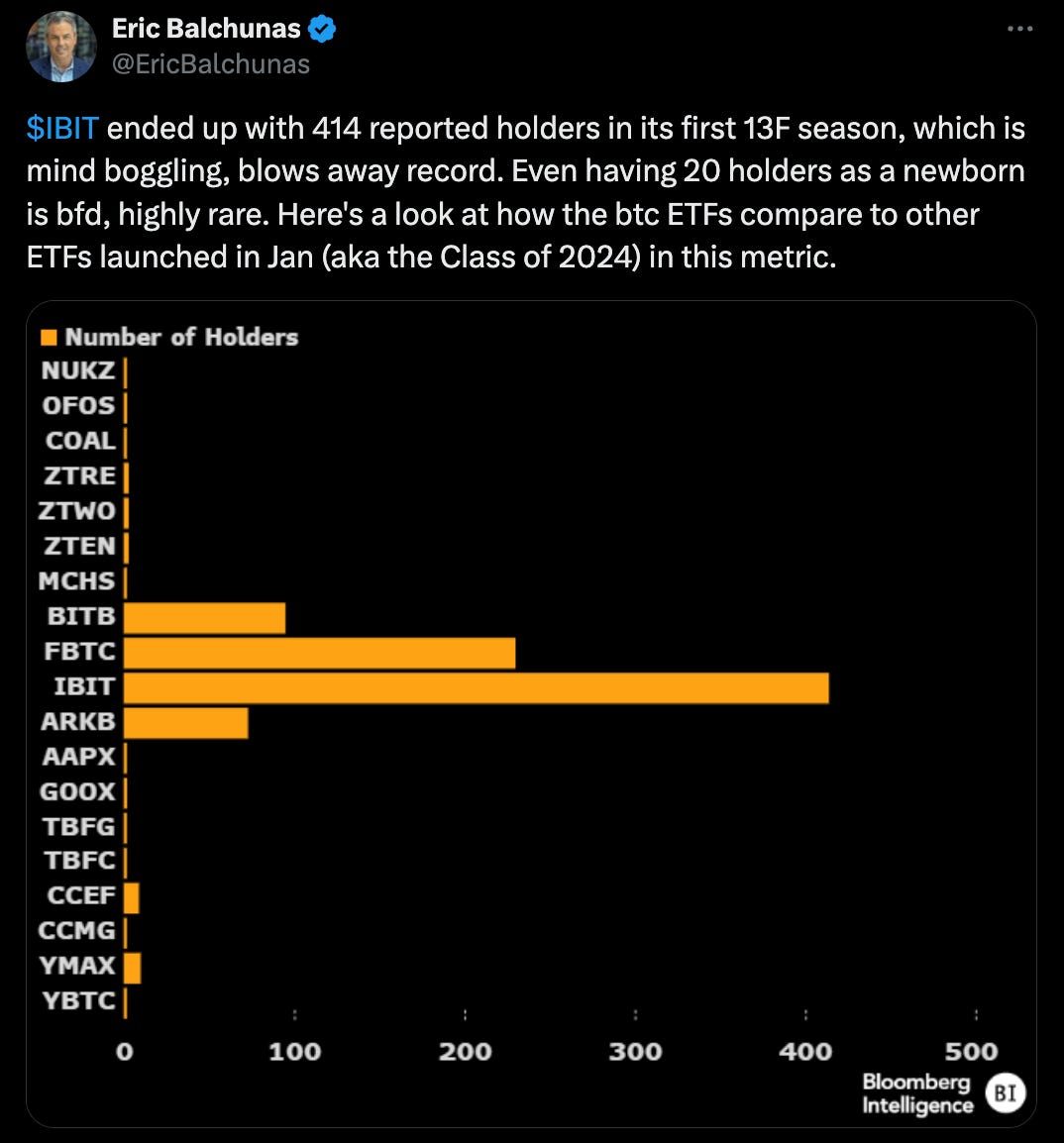 The chart highlights that the BlackRock IBIT BTC ETF, with 414 institutional holders, has become the most successful ETF launch ever, significantly surpassing expectations.