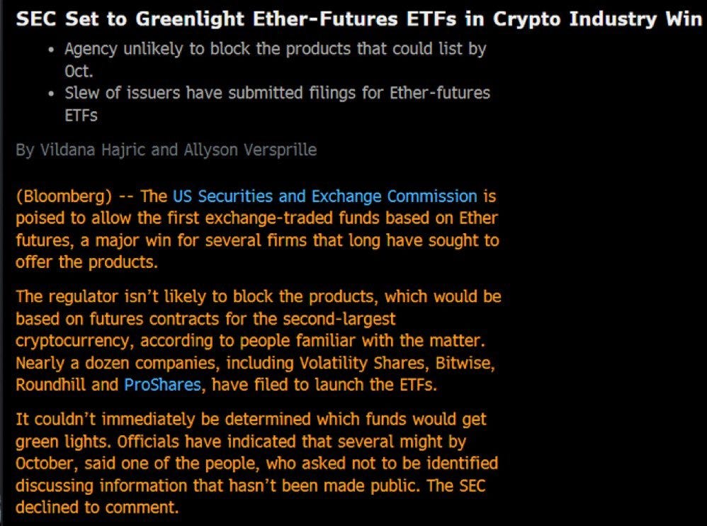 Then, a few minutes after the crash we got another headline: "SEC set to greenlight ETH futures ETF." This does not mean that it is approved, it means that it is very likely that they will not block the approval. Ethereum quickly rebounded on the news and saw a near full recovery.