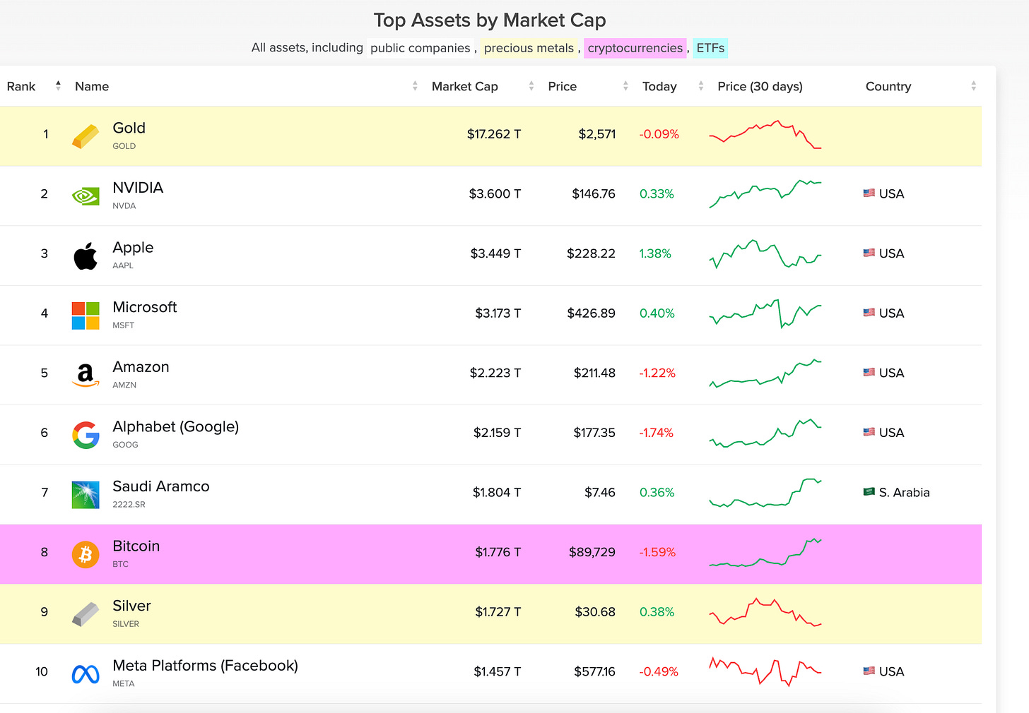 Gold sits comfortably at number one, with a staggering $17.5 trillion market cap. Nvidia is next at $3.6 trillion, and Bitcoin has just smashed silver to claim 8th place. It’s now within striking distance of overtaking Saudi Aramco to become the 7th most valuable asset in the world.