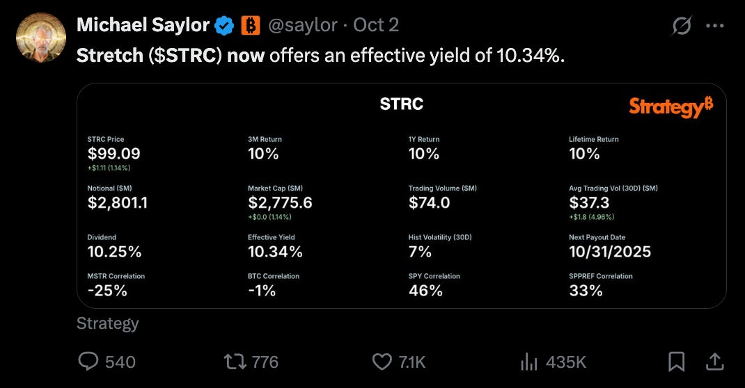 Stretch (STRC) is a variable-rate preferred stock (basically a hybrid between debt and equity — that pays a floating monthly dividend). Think of it as investors lending money to the company in exchange for steady yield and priority over common shareholders — they get paid first, but don’t get voting rights or the upside if the stock rips. It trades around $100 and currently offers an effective yield of about 10.3%. The dividend adjusts depending on short-term market rates to keep the price near par. It’s Saylor’s way of creating yield-backed Bitcoin exposure without touching the banking system. Is this a stroke of genius or something that will end badly…let’s keep going.