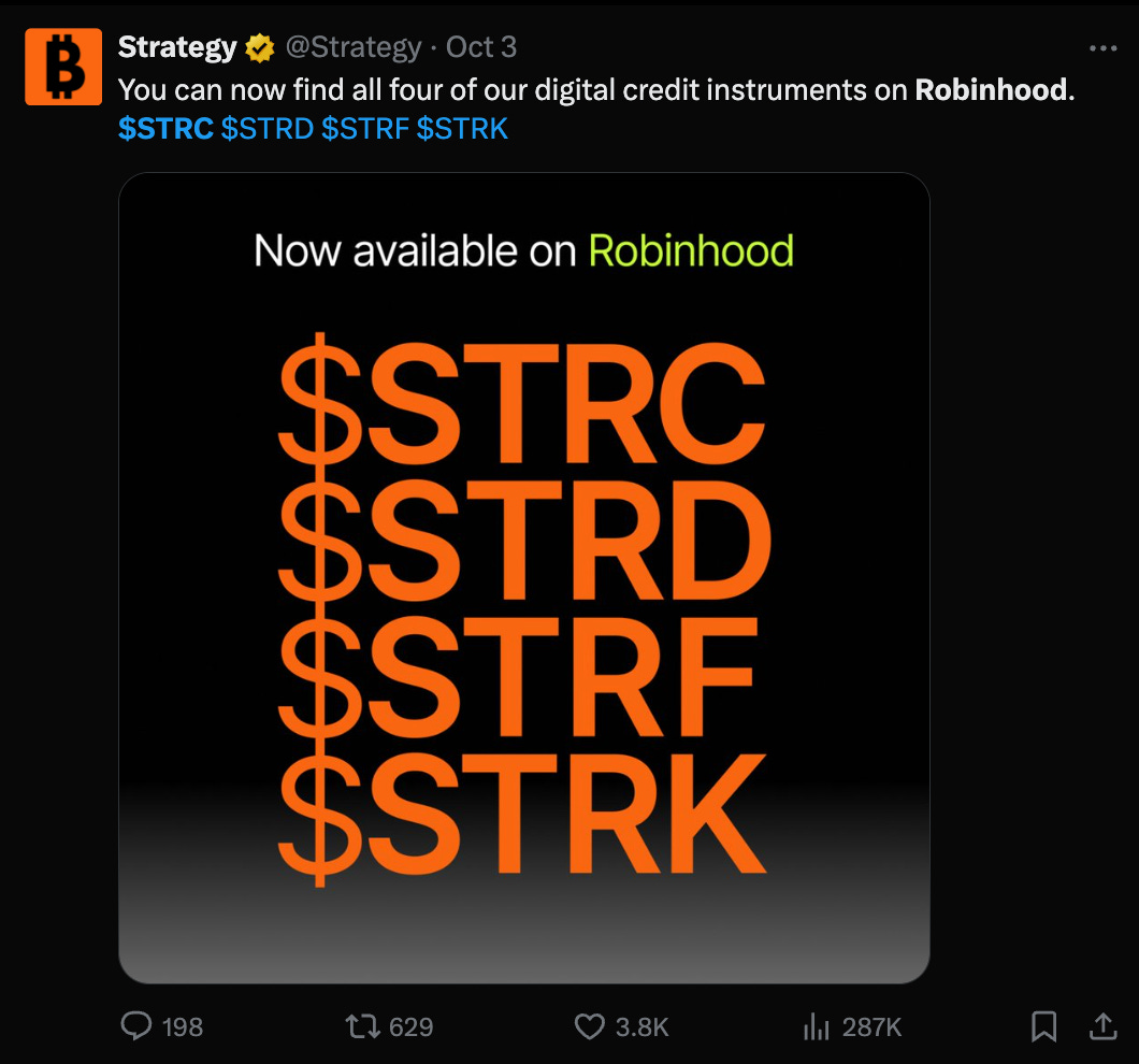 The reason for all of the noise last week was because Robinhood just listed STRC, making it available to millions of retail accounts and giving birth to what CT is calling the “flywheel.” Preferred shares have historically been an institutional product. Now anyone can earn ~10% on something that’s indirectly tied to Bitcoin’s balance sheet — and that got Crypto Twitter’s imagination running wild.