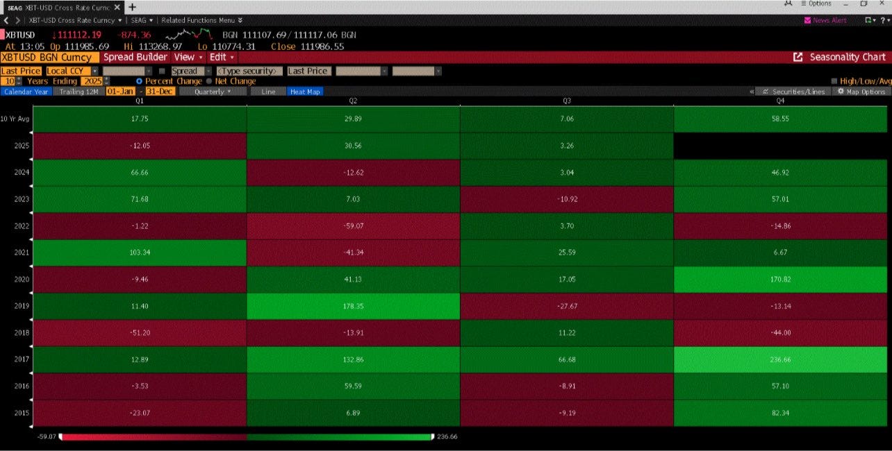 One last thing. My friend sent me this chart this morning: ten-year seasonal returns by quarter for Bitcoin. Close to +60% in Q4.