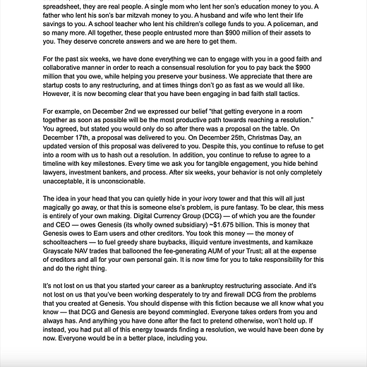 The blow to Genesis’s derivatives business was reported to be in the 9-figure range (eh, what’s 9-figs between friends…better than 10, right). In the wake of FTX’s demise, Genesis suspended customer redemptions last month and told clients that they needed time to resolve the financial crisis plaguing its lending business. One of Genesis’s largest clients is the Winklevii’s exchange, Gemini. Unfortunately, Gemini is not just a large institution, but one that has hundreds of thousands of customers caught up in this mess through Gemini’s Earn program, which is essentially a front-end application for Genesis’s lending business. Regular folks like a “single mom who lent her son’s education money to you” and a “father who lent his son’s bar mitzvah money to you” — as per Cameron Winklevoss’s open letter to Barry Silbert last week — are wondering if their collective $900m will ever be made available to them.