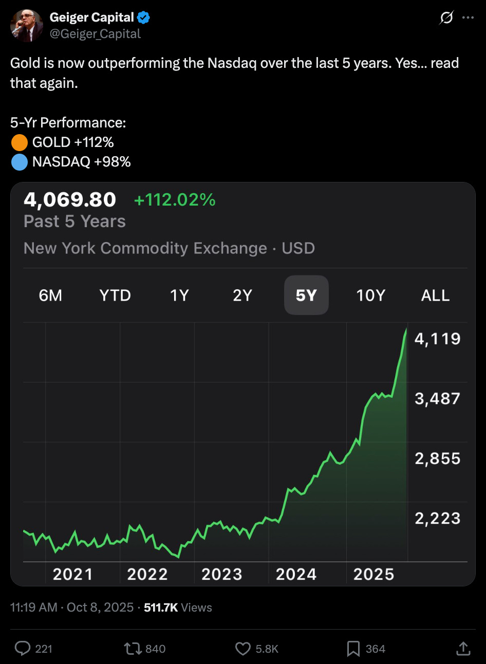 You might feel like you’re crushing it in the S&P 500, but you’re actually getting crushed by a shiny gold rock. Even the Nasdaq is underperforming gold now that it’s ripped past $4k. In BTC terms, everything’s been taken out to the woodshed.