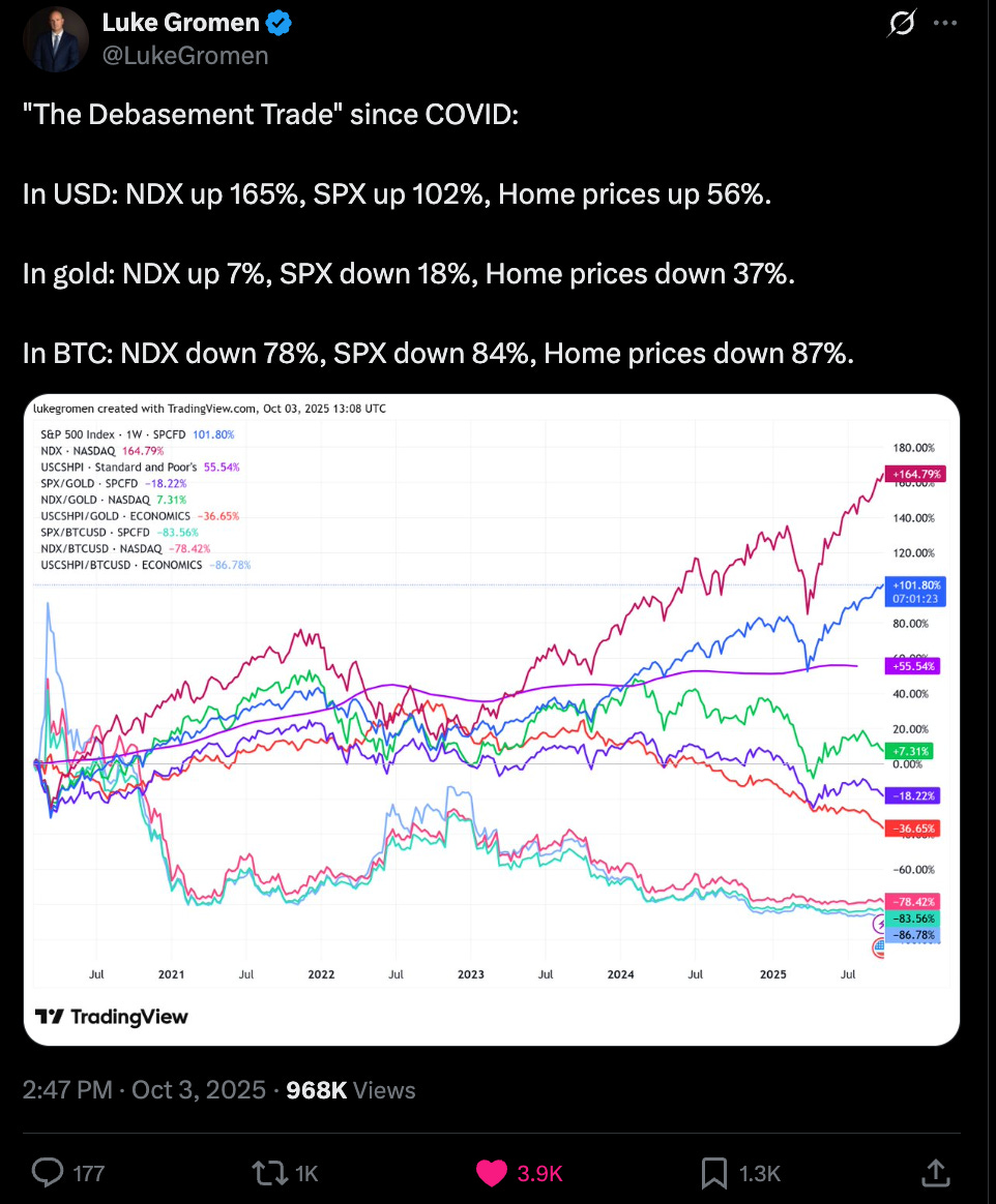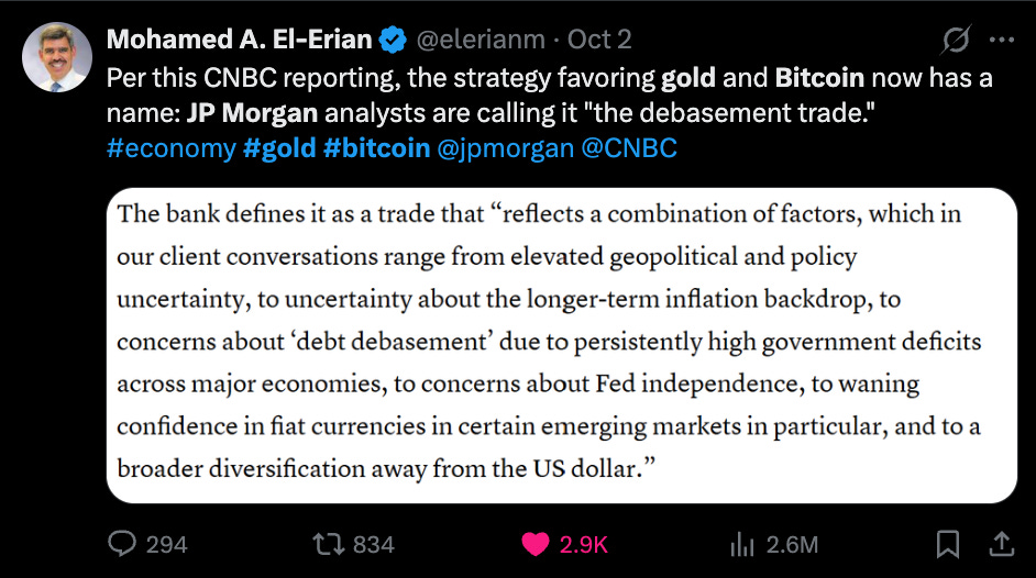 These are serious flows into BTC, but quiet ones. If the market were truly “over,” $110K wouldn’t have held at the end of September. That push to fresh all-time highs in just a few days was an impressive bid — and it wasn’t Saylor in the order books. This is the new narrative on everyone’s mind: the debasement trade.