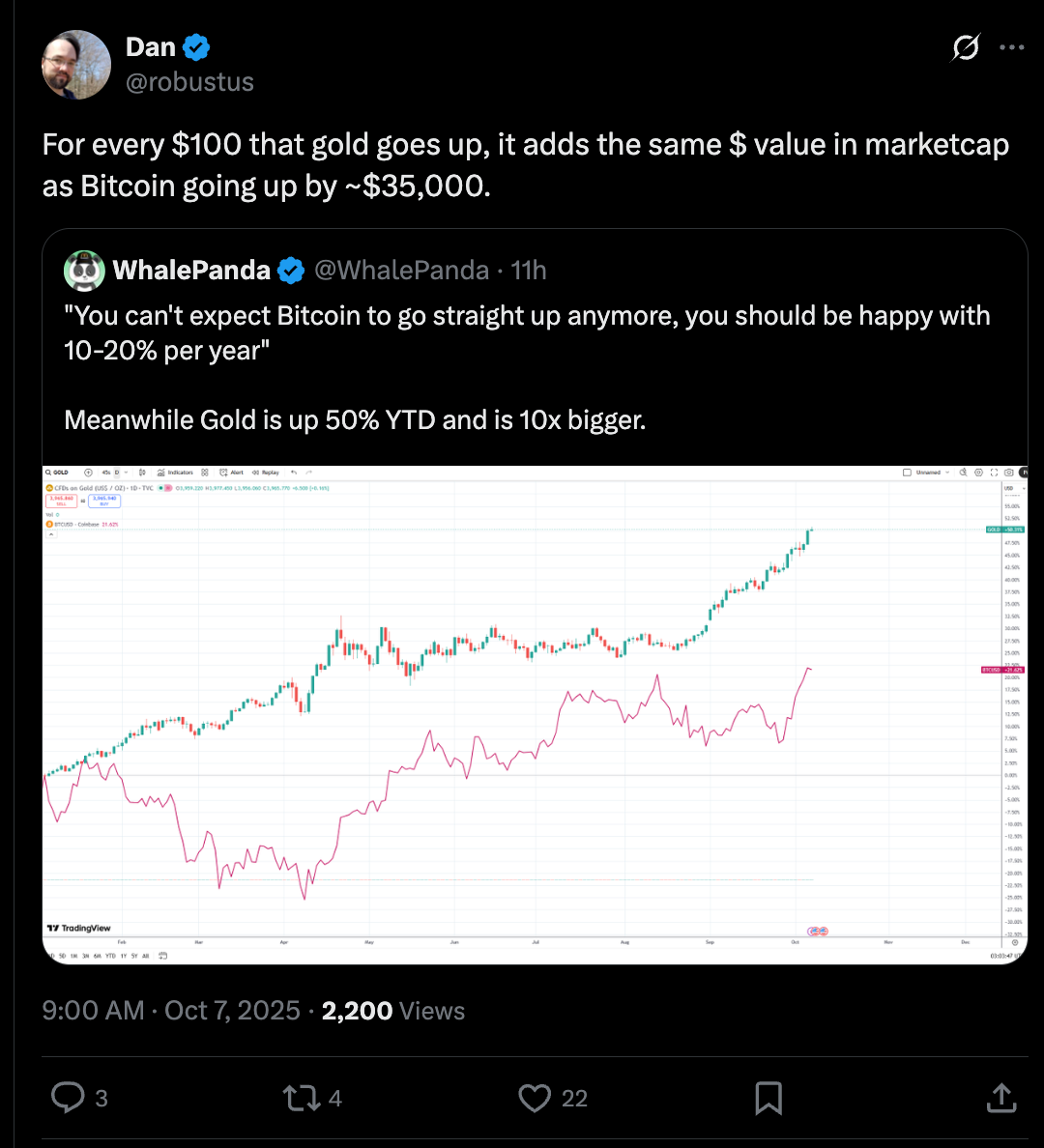 And as Dan pointed out this week, every $100 gold goes up adds the same dollar value to global market cap as Bitcoin going up by roughly $35,000. Please, let that sink in.