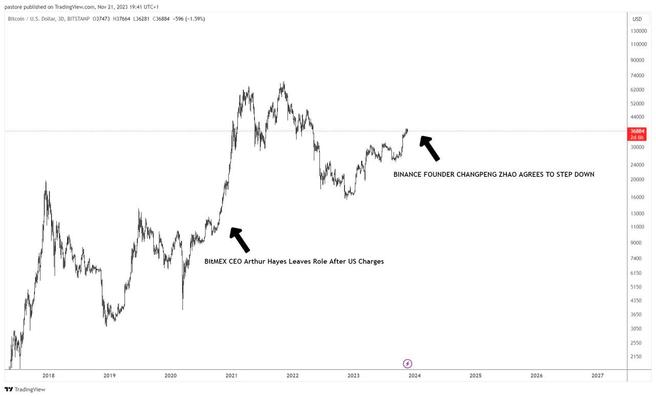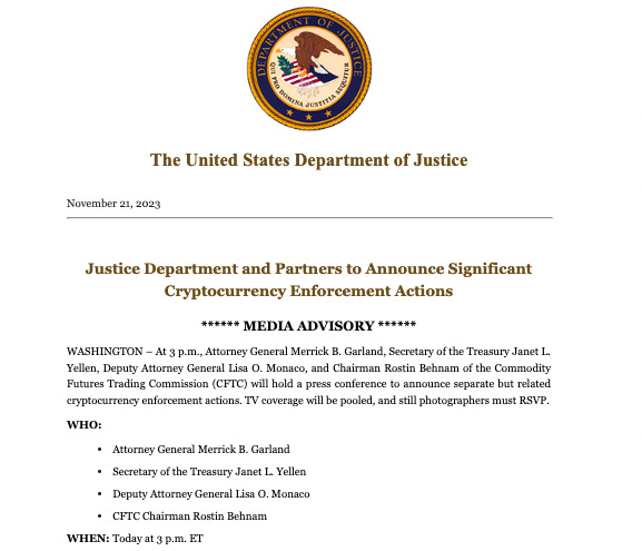 Tuesday was one of the most volatile days in crypto I’ve ever experienced. First, news broke that Kraken was being charged by the SEC, which sent prices down across the board with alts leading the way as the SEC highlighted a number of popular tokens as securities. Then we heard a rumour, which was quickly confirmed, that Binance was to settle with the US for $4 billion. Soon after there were rumours that CZ was in talks to step down as part of the settlement. The bulls and bears were at each other’s necks until the US DOJ added to the uncertainty in a terrifying way with an announcement before the announcement of “significant cryptocurrency enforcement actions” at 3pm. When I read this, half of me was like, “It’s over man” and the other half of me — which I’ve learned to listen to over the past couple years — was like, “You’re scared? Good, buy more!” As BTC moved down, I hit the buy button a couple of times and geared up for what was hopefully just an announcement about the Binance settlement and nothing more.