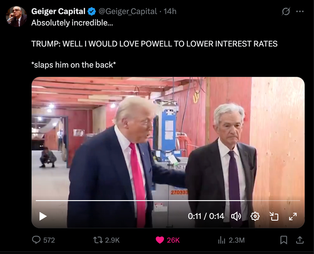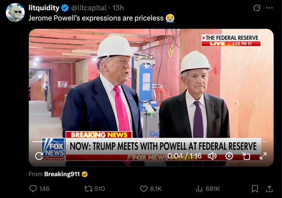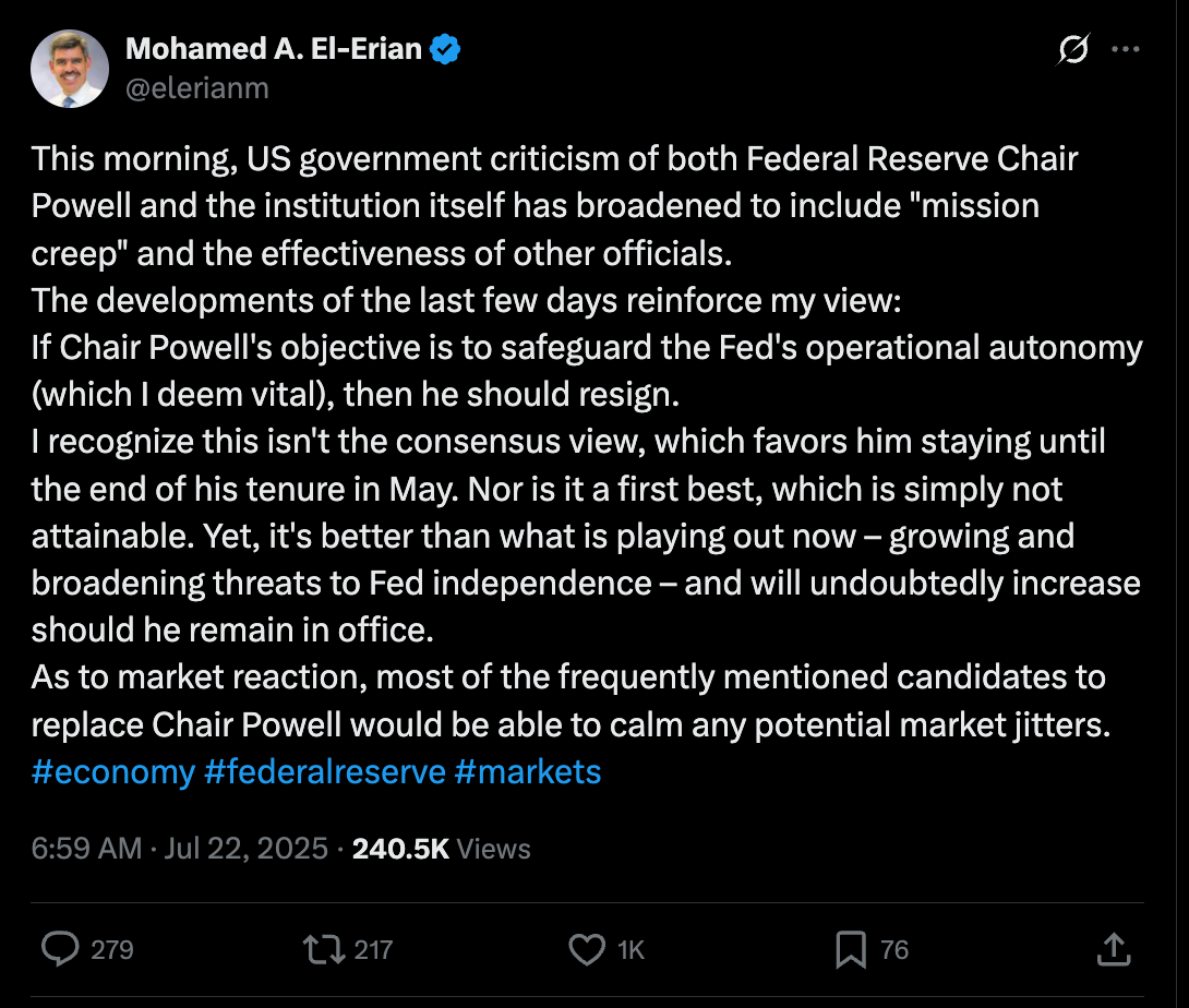 This week, high-profile voices — from Mohamed El-Erian to Senator Cynthia Lummis — are openly calling for Fed Chair Jerome Powell to resign. Surprising to me but El-Erian chimed in this week and said Powell should step down to preserve the Fed’s credibility and operational independence. Lummis went further, saying he's "fatally wounding" the Fed’s role altogether.