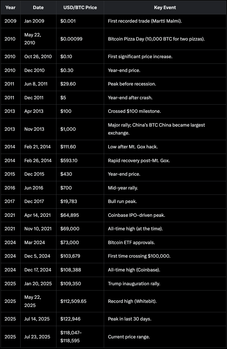 I asked Grok to give me a historical USD/BTC price overview from 2009–2025 since I couldn’t find any charts that go back that far because of BTC’s irrelevance at the time.